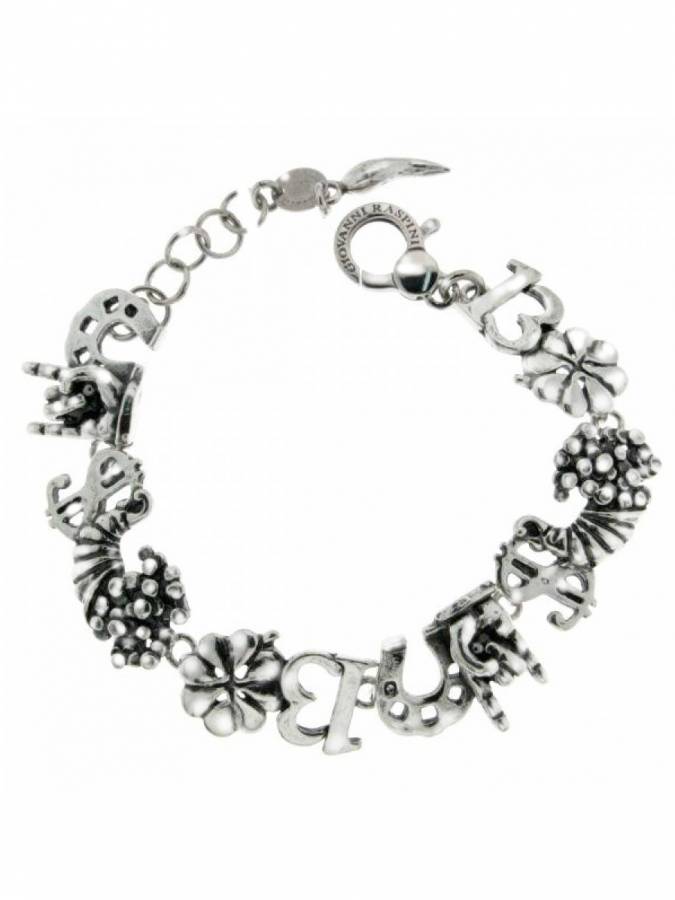 Ecco un bel bracciale che raggruppa tanti portafortuna, un must-have di Raspini. Lunghezza regolabile da 18 a 20 cm.