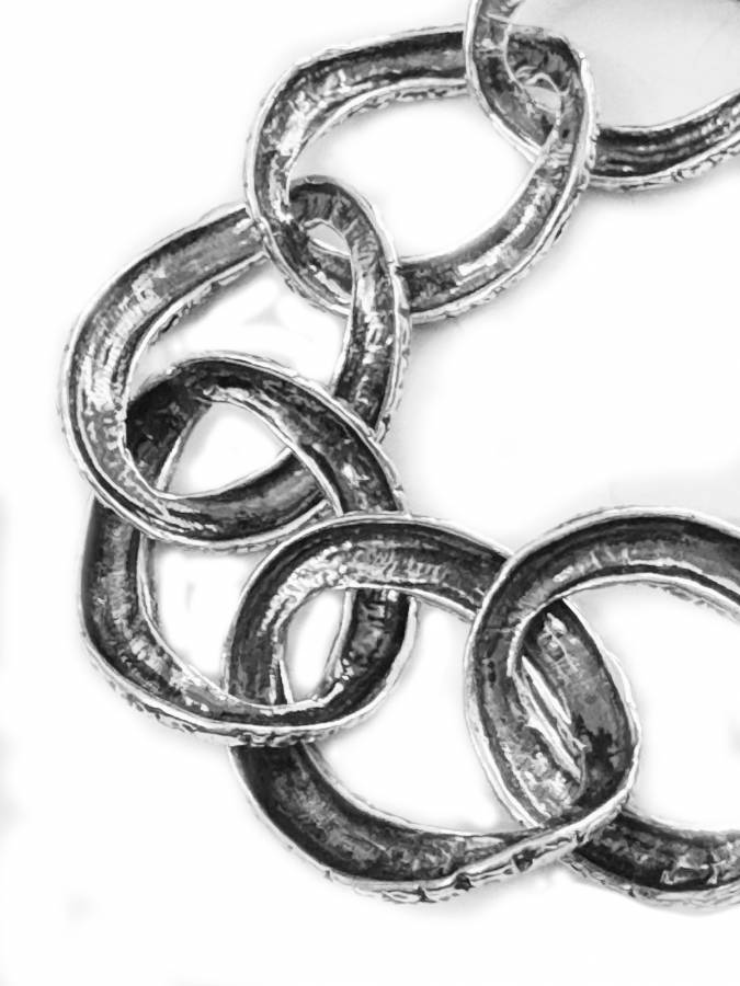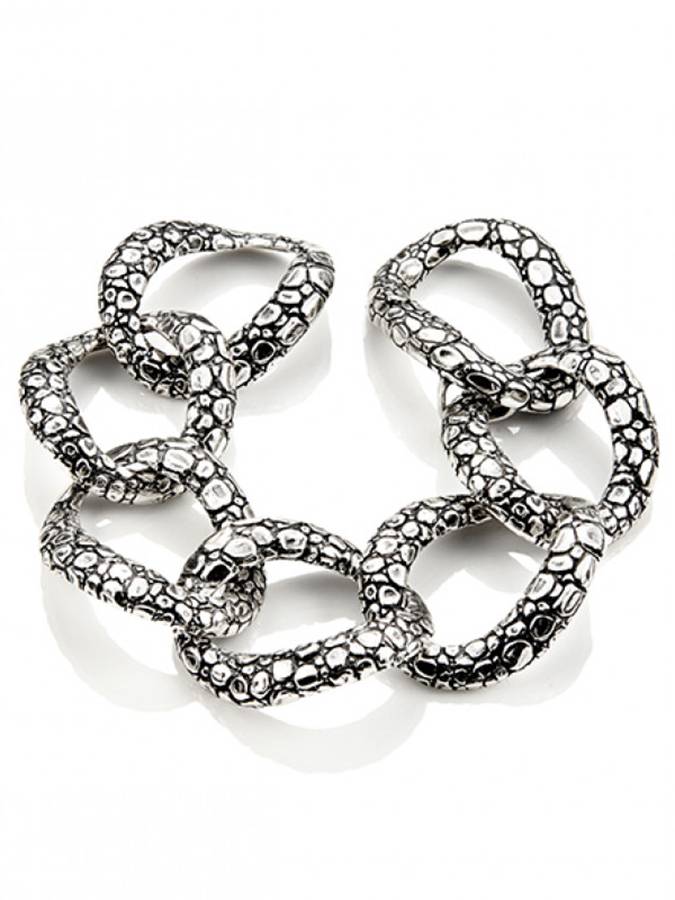 E´ un bracciale ritirato da tempo, ricercato dai collezionisti. Ha magliemodellate con superficie effetto coccodrillo, ma è cavo all´interno, in modo che torni bene e aderisca al polso. E´ sempre fuso a cera persa ed è molto particolare e consistente.