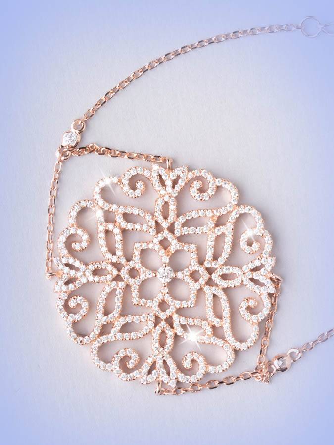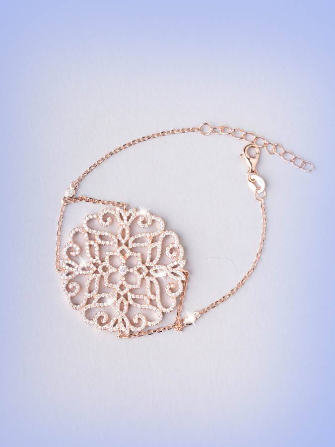 E´un bracciale molto decorativo in argento 925 galvanizzato in oro 18 kt, con catenine rolò che sorreggono un rosone centrale di 3.5 cm di diametro, traforato e tempestato di luminosi zirconi. Misura 16 cm che possono essere aumentati attraverso una catenina di allungo di 3.5 cm.