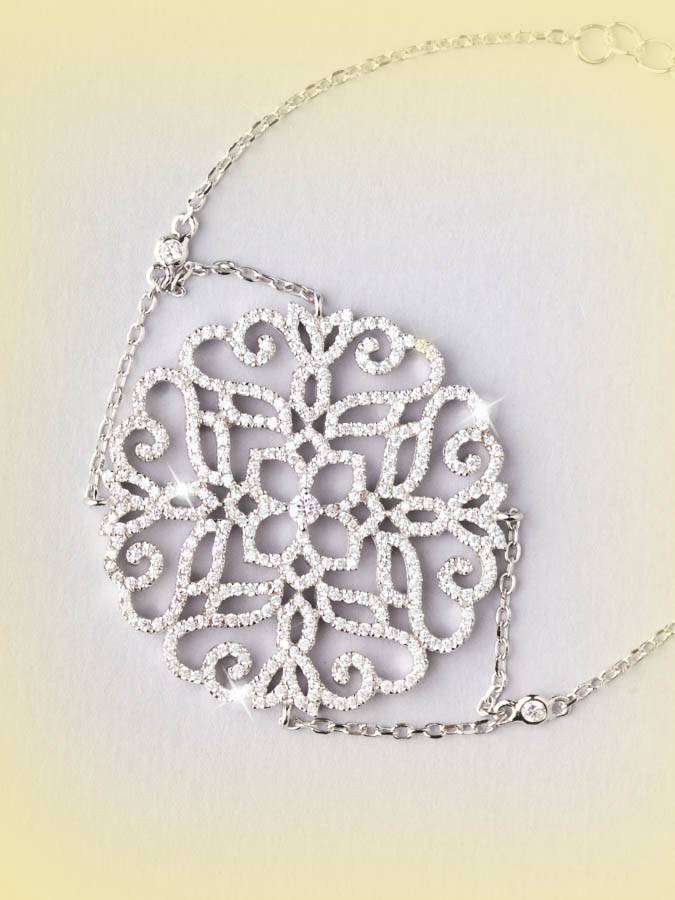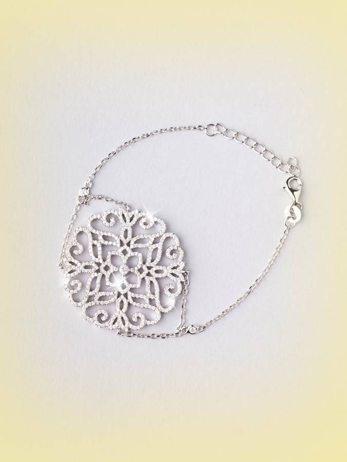 E´un bracciale molto decorativo in argento 925 galvanizzato in rodio, con catenine rolò che sorreggono un rosone centrale di 3.5 cm di diametro, traforato e tempestato di luminosi zirconi. Misura 16 cm che possono essere aumentati attraverso una catenina di allungo di 3.5 cm.
