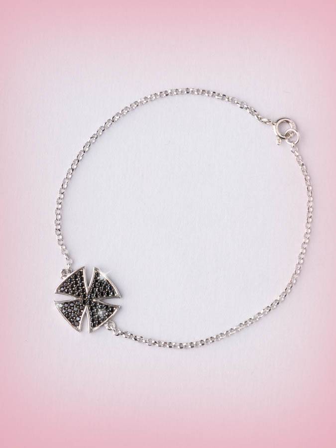 E´ un bracciale leggero formato da una sottile catenina rolò al cui centro figura una crocetta greca a pavé di zirconi neri. Il bracciale in argento 925 è galvanizzato in rodio e misura 18 cm.