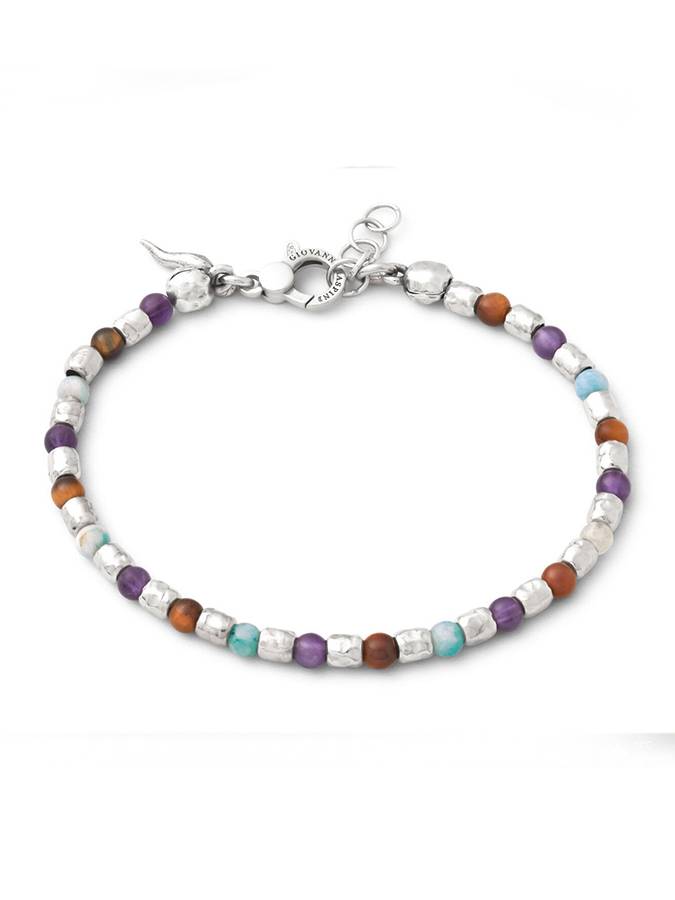 Ci sono tutti i colori del cielo in queste sferette in emimorfite, ametista ed occhio di tigre alternate a piccoli elementi in argento fuso a cera persa e brunito per dar vita a questo delicato bracciale. Lunghezza 22 cm.