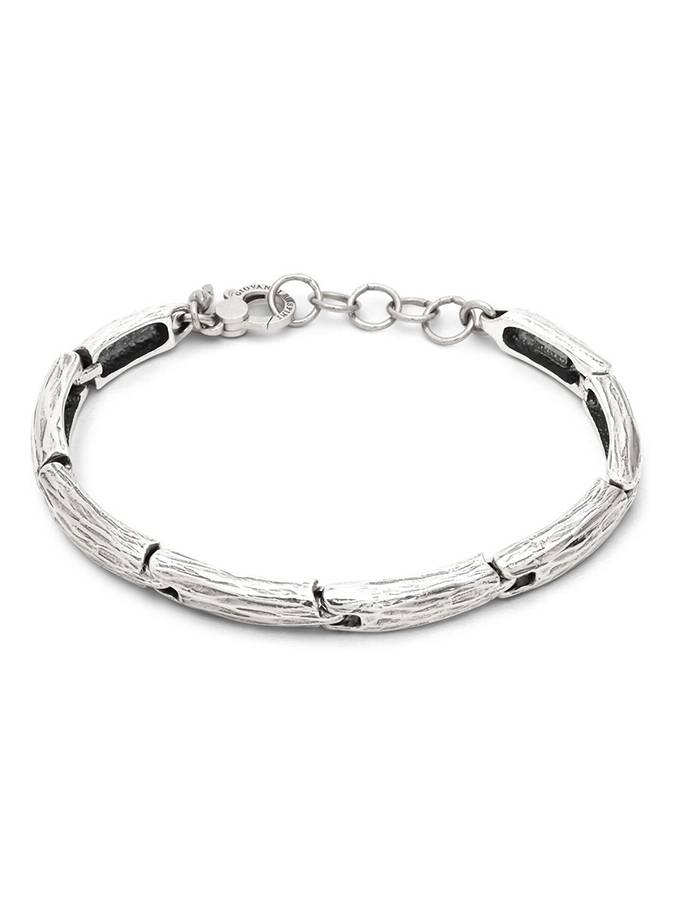 Questo particolarissimo bracciale è realizzato con una catena in argento di grandi elementi spatolati fusi a cera persa. Un gioiello materico, dalla texture luminosissima. Lunghezza 20 cm.