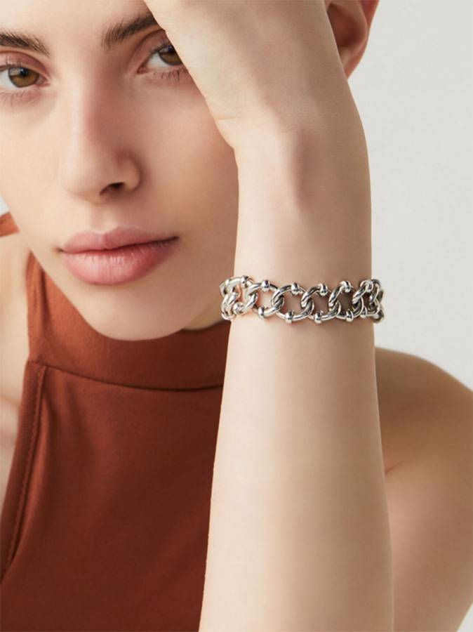 Questo bracciale in argento trasforma una catena classica in un gioiello luminoso e di grande resa plastica e materica. Fatto a mano in house.