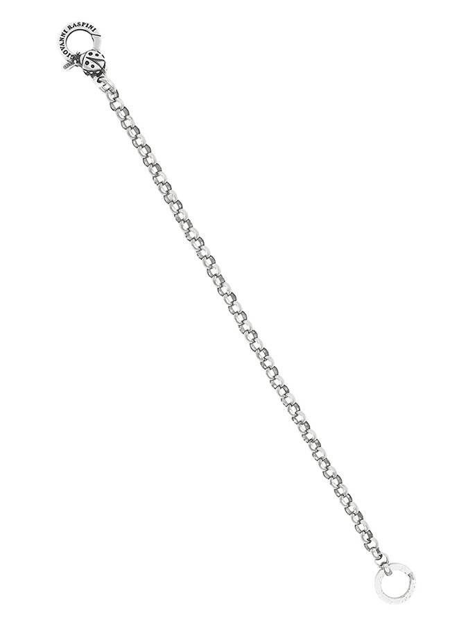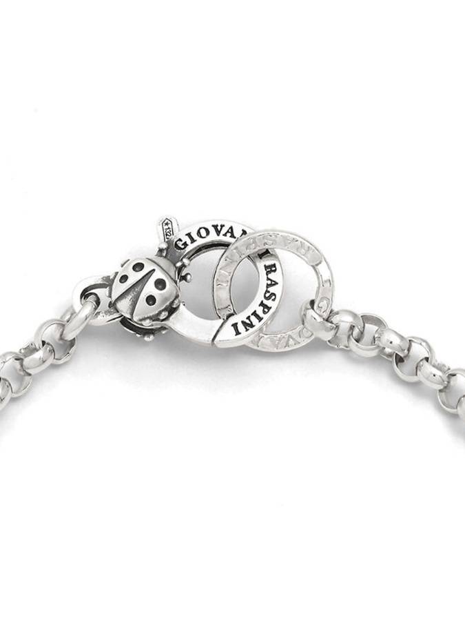 Realizzato in catena rolò d’argento, questo gioiello si distingue per la chiusura con brisé logato e un delicato decoro a forma di coccinella, fuso a cera persa. Lunghezza cm 20.