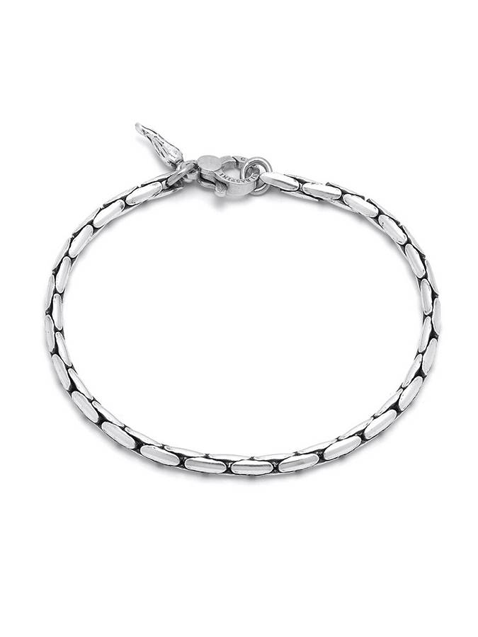 E´ un bracciale a catena particolare, le cui maglie si accostano in un susseguirsi continuo, tanto da far apparire il gioiello come un filo luminoso. La misura L è di 21 cm ed esiste anche la versione M di 19 cm. ricevibile in pochi giorni.