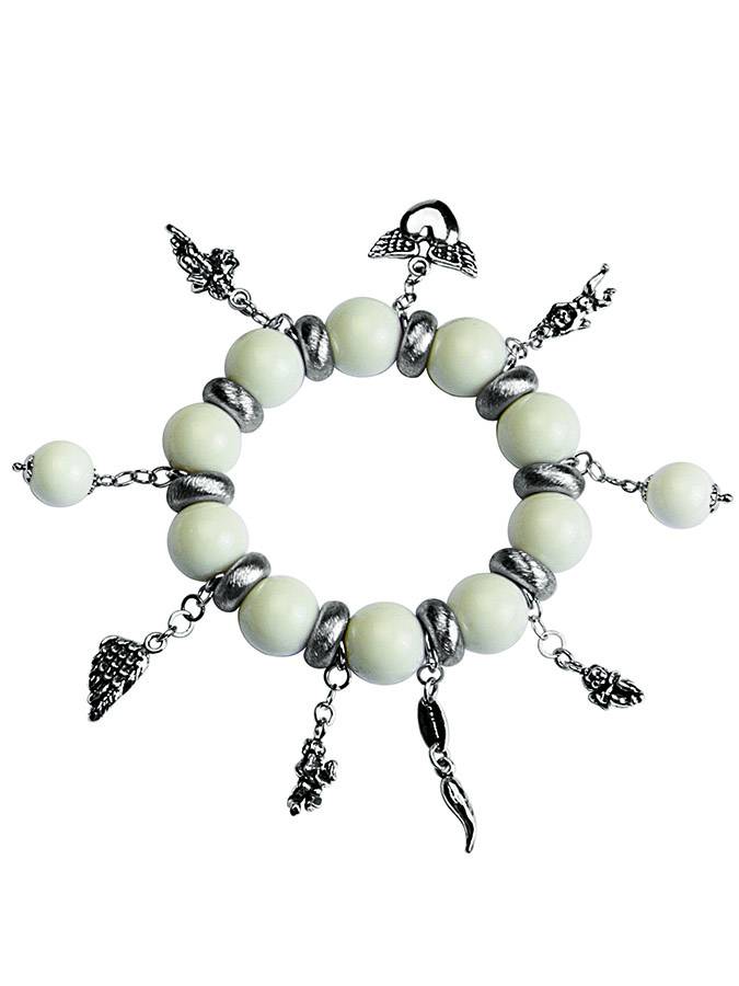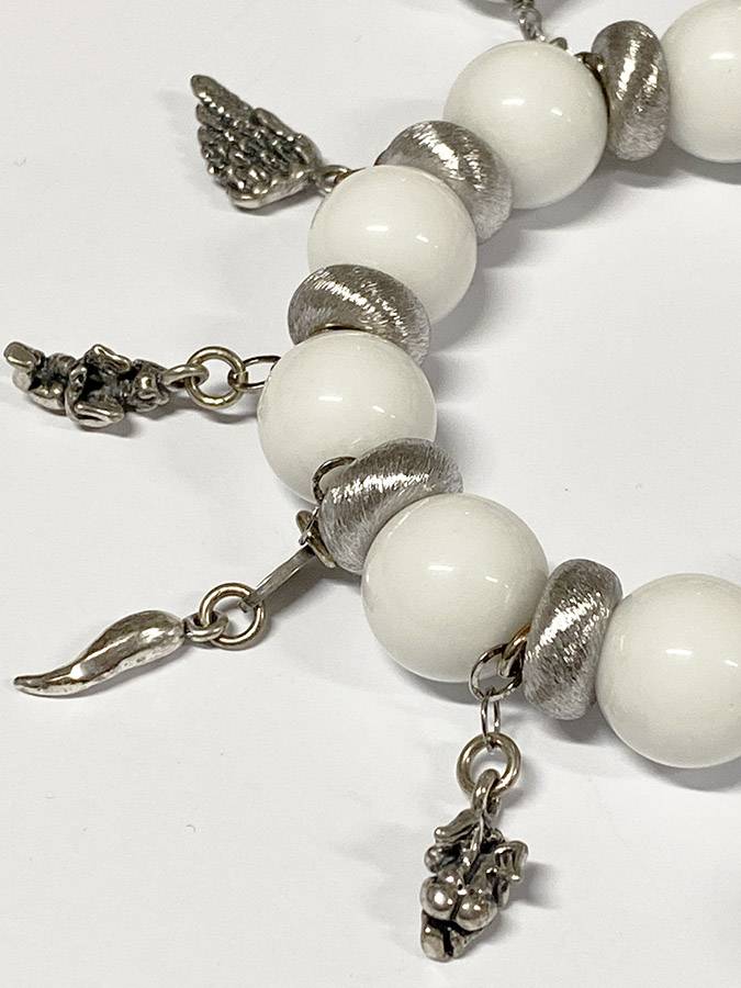 E´ un bracciale in agata bianca, inframezzata da 10 grandi ciambelle in argento satinato, montato su elastico, con nove charms a tema Angeli e cuori. il fatto che una ciambella non abbia il charm pendente non è un difetto, il bracciale è nato proprio così. E´ un pezzo da collezionisti perché fuori produzione da tanti anni, quindi difficilissimo da trovare. Ovviamente è nuovo, mai indossato.