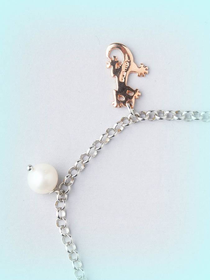 Ad una catena rolò sono appesi tre piccoli geki portafortuna in argento placcato in oro rosa e quattro perle di acqua dolce.