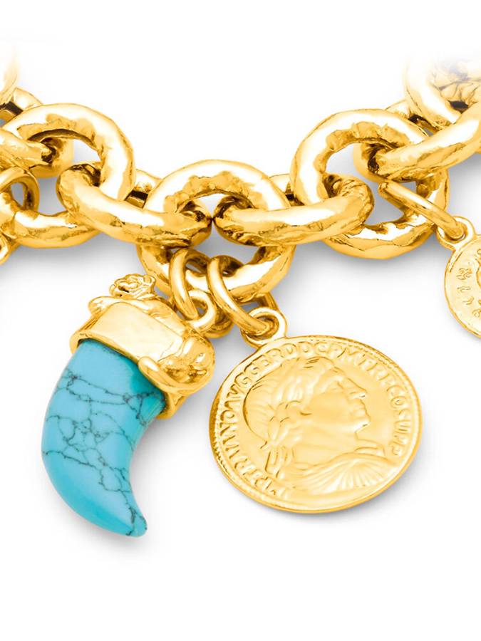 Tutto il fascino della fusione a cera persa in un bracciale a maglia tonda in bronzo dorato con finitura martellata, impreziosito da monete e da una zanna in pasta di turchese sormontata da un decoro a forma di puma. Lunghezza cm. 21