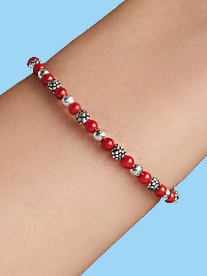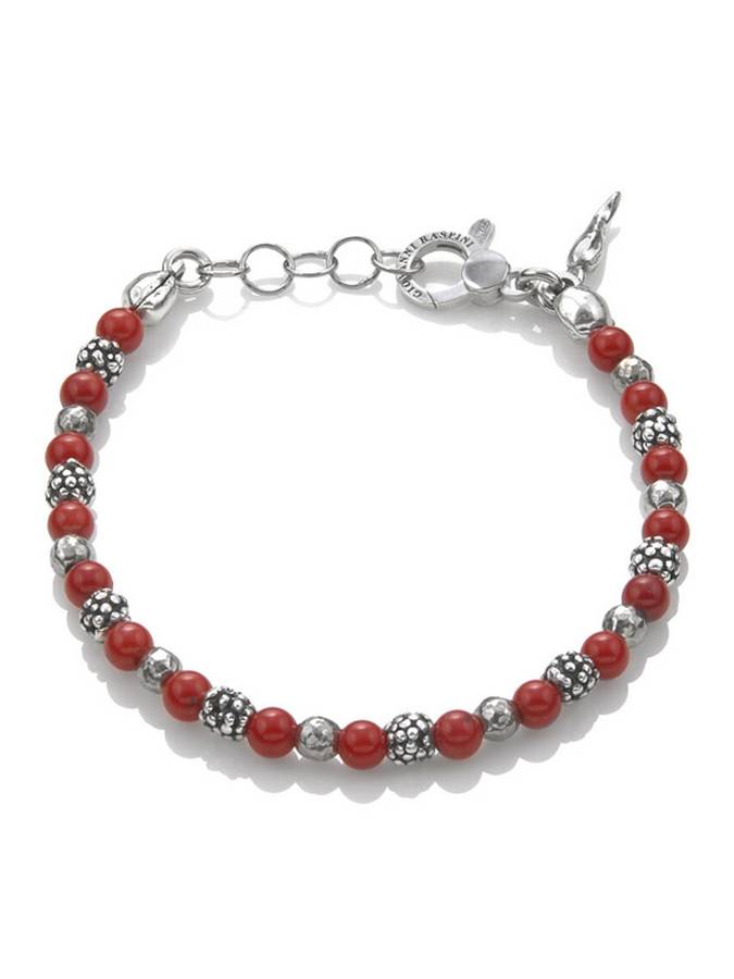 Piccoli elementi in argento brunito, alternati alle sferette color corallo, rendono questo bracciale un piccolo capolavoro di eleganza contemporanea. Lunghezza cm. 19