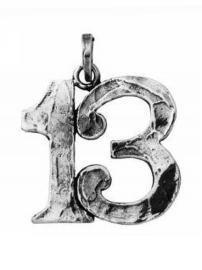 Grande pendente a forma di numero 13 portafortuna. Misura cm. 3.5x3.5 e ha per maglia di aggancio la maglia apribile di Raspini. Fuori produzione da tempo.