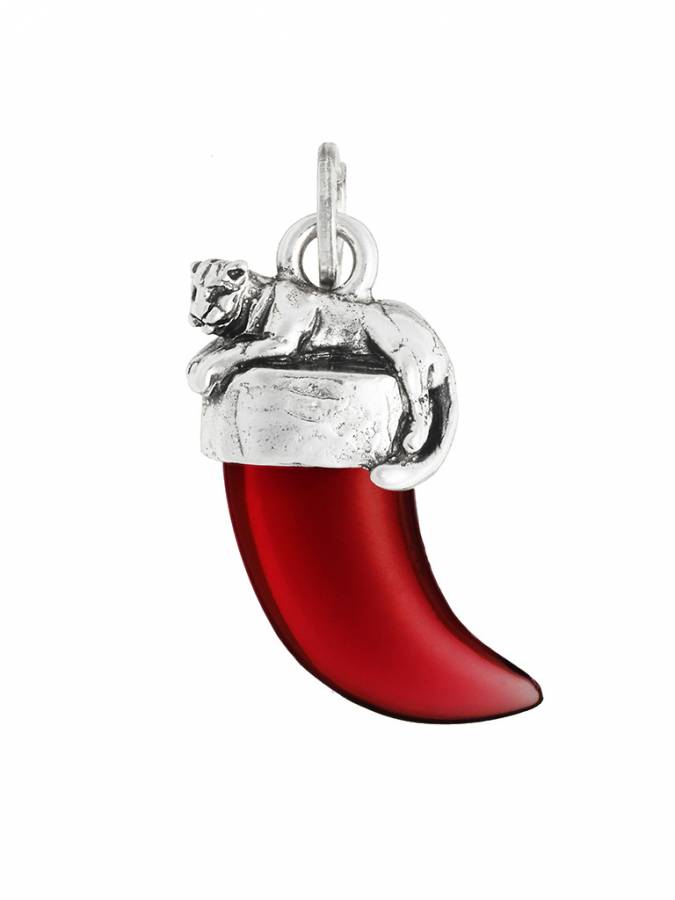 UnŽaffascinante armonia tra forza e stile prende forma in questo charm. La zanna, in resina color bordeaux, è sospesa a un decoro in argento brunito, che riproduce una pantera distesa, simbolo di eleganza e potere. Misura cm 3.7 esclusa la maglia di aggancio.