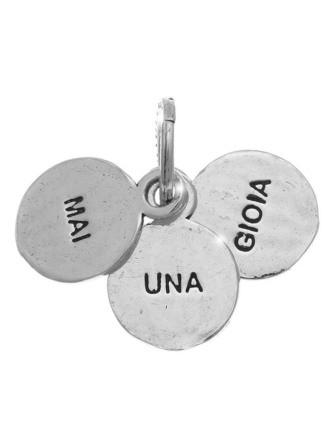 E´ un simpatico charm formato da tre medagliette che riportano scritte diverse. In questo si legge MAI UNA GIOIA. Le monetine hanno un diametro di cm. 1.2. collegate con la maglia rotonda con logo Raspini di cm. 0.9