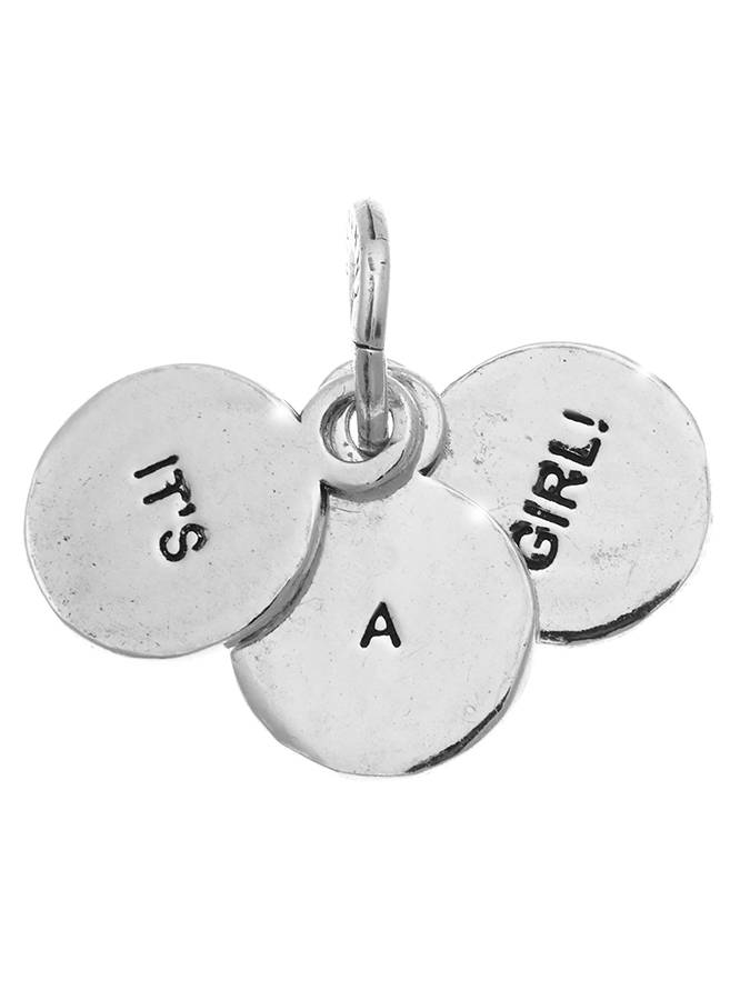 E´ un simpatico charm formato da tre medagliette che riportano scritte diverse. In questo si legge IT´S A GIRL. Le monetine hanno un diametro di cm. 1.2. collegate con la maglia rotonda con logo Raspini di cm. 0.9