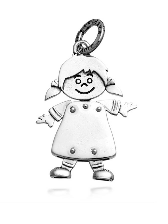 E´ un charm simpatico perché raffigura una bambina con le gambe e le braccia snodate. E´ lungo cm. 3.2 senza la maglia logata di aggancio.