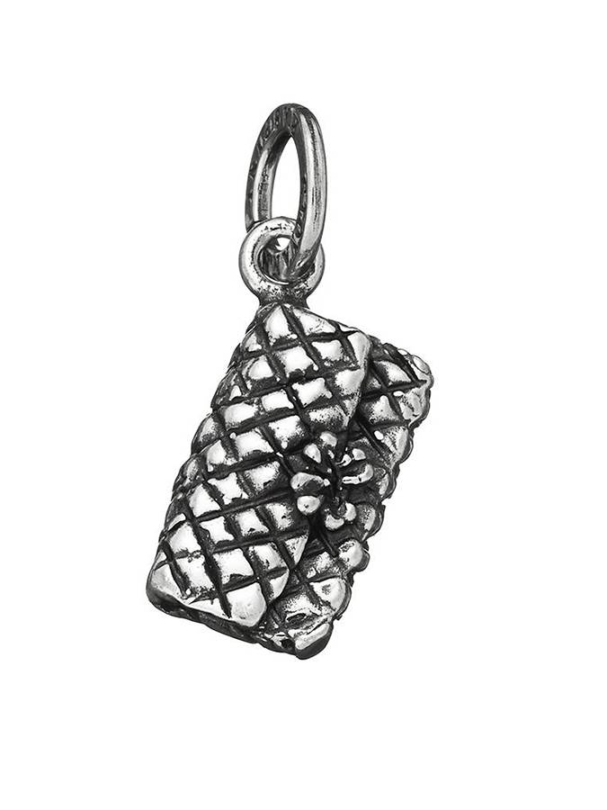 Ecco una piccola pochette trapuntata, lavorata nei dettagli raffigurata in queato charm.Misura in lunghezza 2.3 cm. senza la maglia rotonda e logata di aggancio.