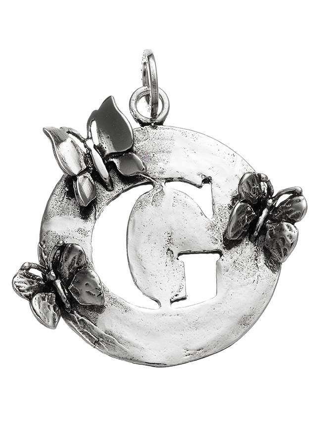 Questa linea di pendenti è bellissima. Il medaglione ha un diametro di 3.5 cm con delle deliziose farfalle che volano anche oltre il bordo e una lettera traforata al centro. La lavorazione è molto accurata.