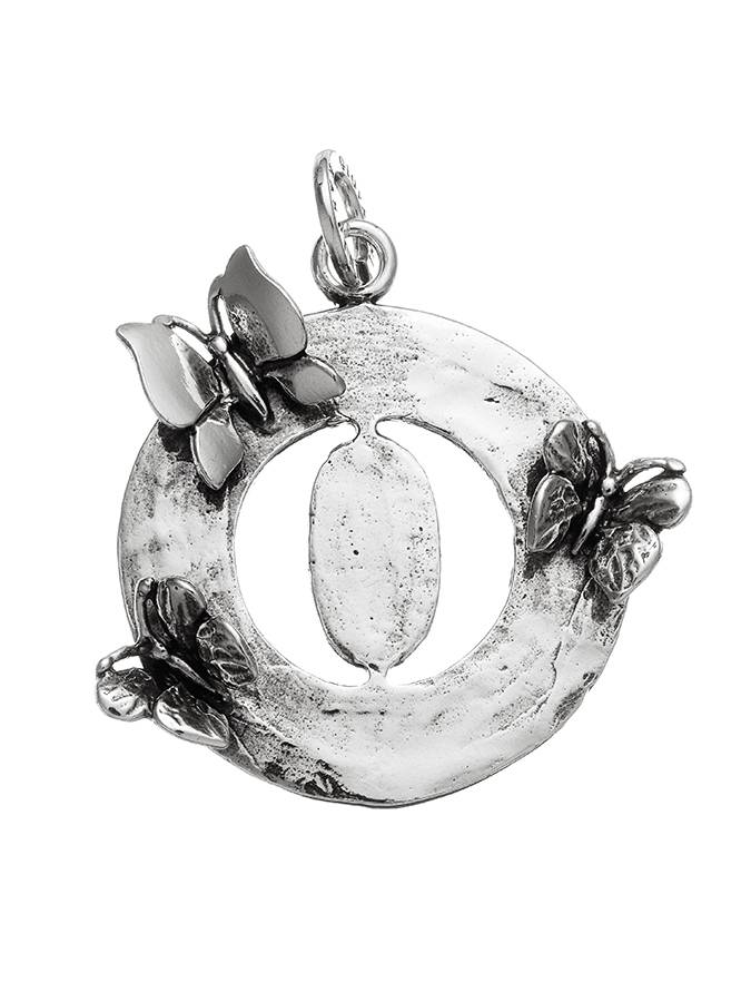 Questa linea di pendenti è bellissima. Il medaglione ha un diametro di 3.5 cm con delle deliziose farfalle che volano anche oltre il bordo e una lettera traforata al centro. La lavorazione è molto accurata.