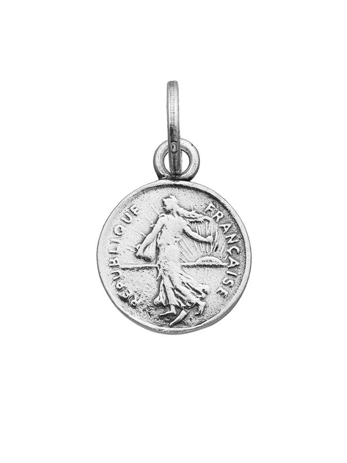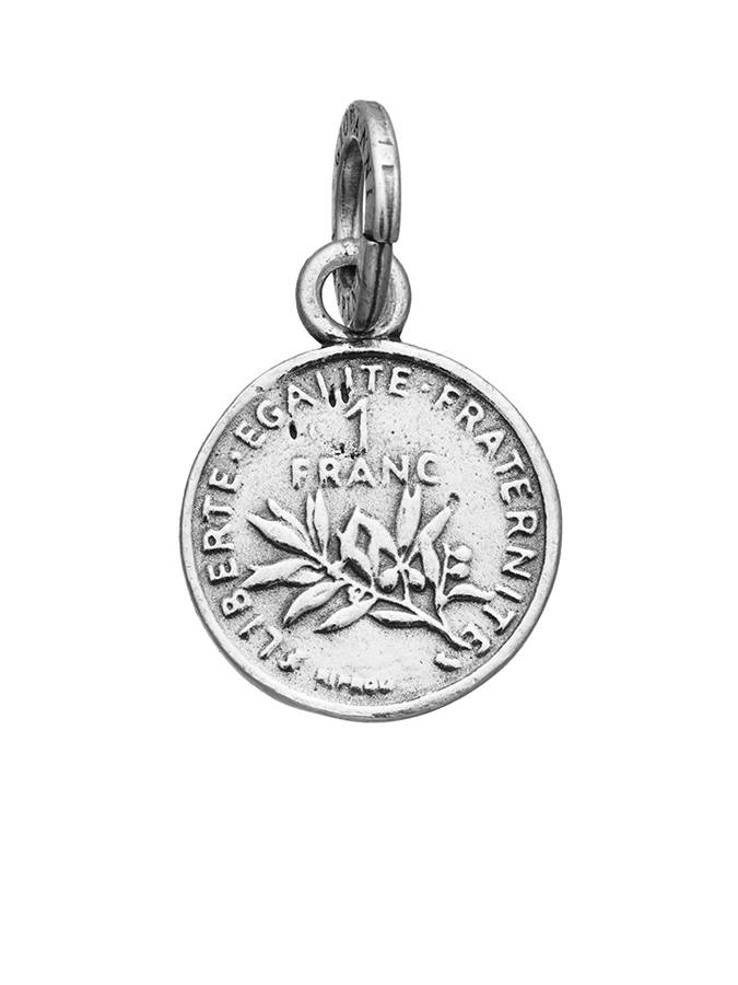 Charm a moneta di cm. 1.6 di diametro che raffigura da un lato dei ramoscelli di olivo e dall´altro una seminatrice dalla figura esile ed elegante.