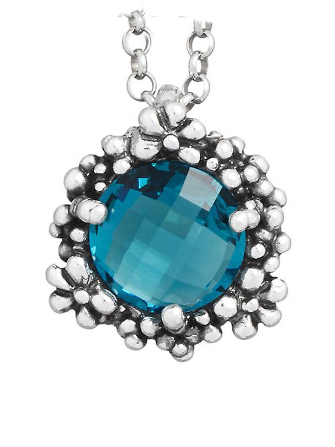 Un cristallo rotondo e sfaccettato color celeste è contornato da un delicato lavoro floreale creato a cera persa. Completa il gioiello una catena rolò in argento lunga 45 cm. il solo pendente misura 1.8 cm.