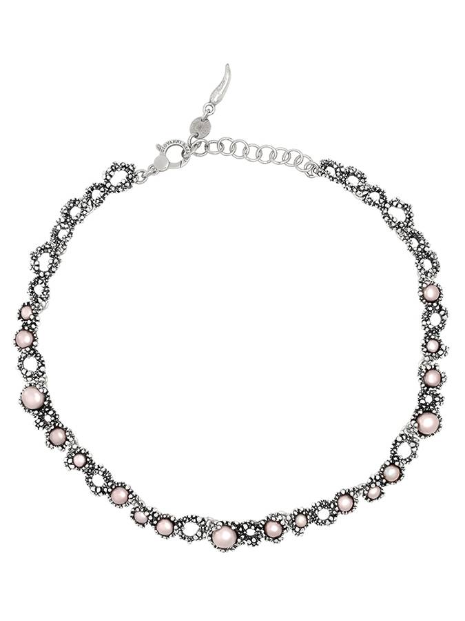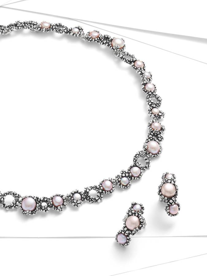 Un motivo floreale, realizzato in argento fuso a cera persa e poi brunito, sprigiona riflessi preziosi grazie alla diamantatura eseguita a mano, esalta la bellezza di perle d’acqua dolce dalle delicate sfumature rosa. Lunghezza cm. 45