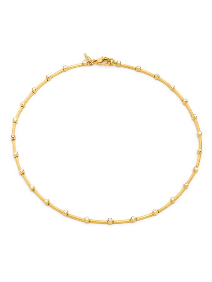 Leggerezza, eleganza e luminosità si fondono in questa collana dalla bellezza lieve. Ventisei elementi impreziositi da delicati punti luce in zircone, come piccole stelle, catturano lo sguardo. Lunghezza cm. 44.