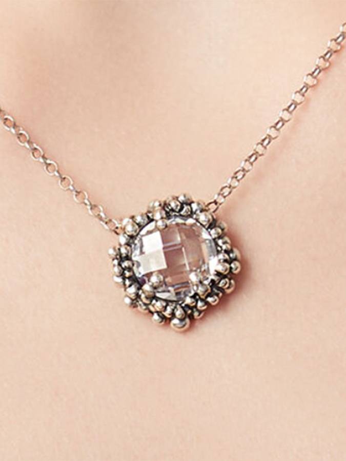 E´ un pendente raffinato e luminosissimo. La delicatezza della manifattura e la luce emanata dallo zircone sfaccettato centrale lo rendono molto elegante ma anche facile da indossare. La catenina è lunga 45 cm.