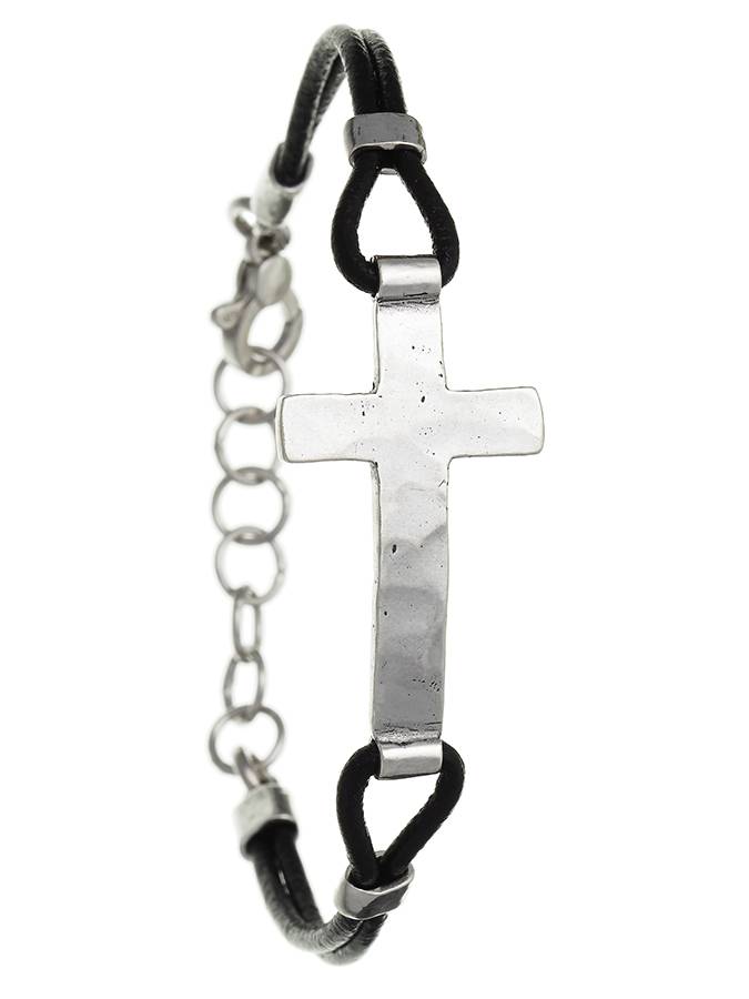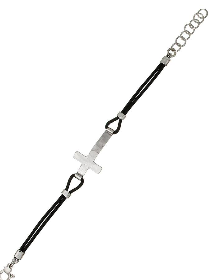 Bracciale in argento 925 e cordino di cuoio nero di 2 mm con una croce centrale che misura 3,5x2 cm. Il bracciale è lungo cm. 22 compresa la catenina di allungo.