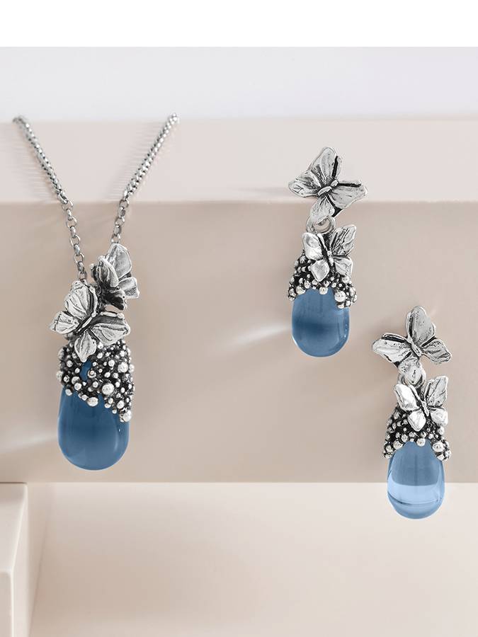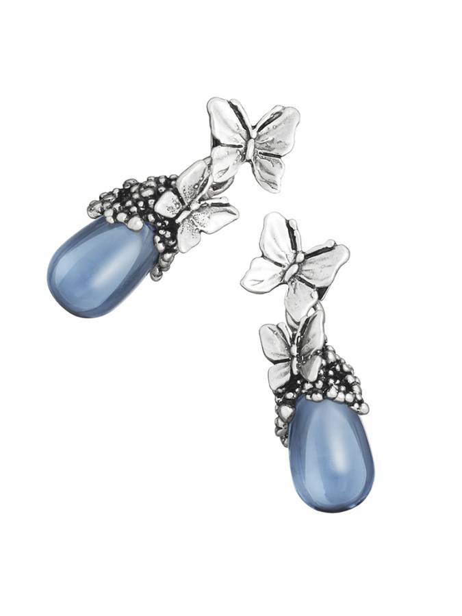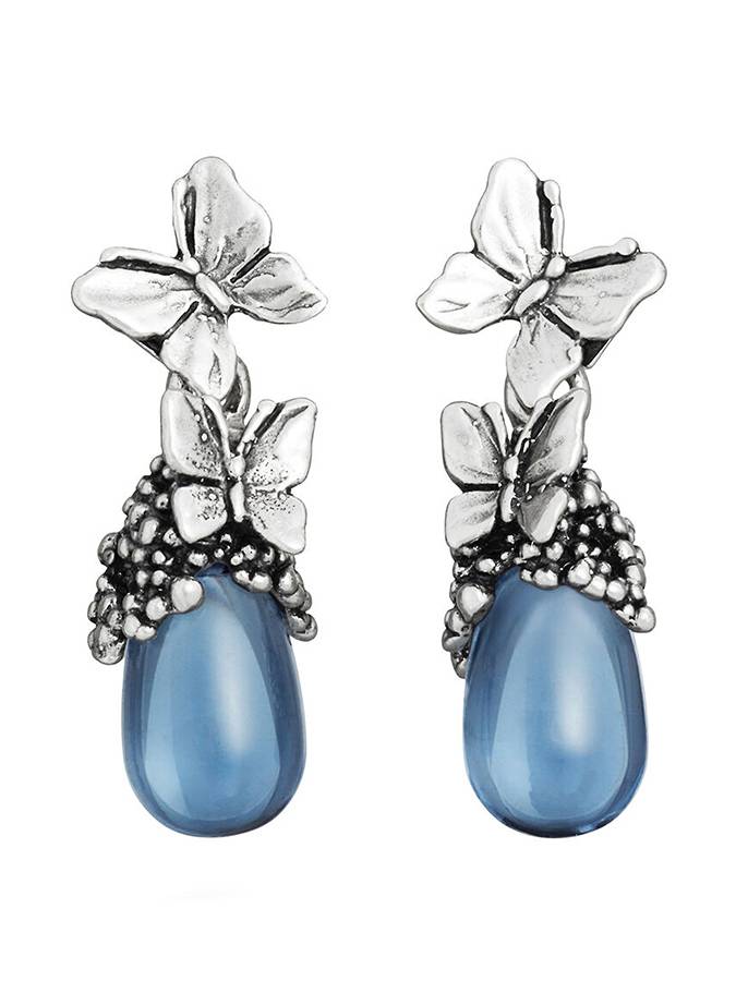 Gli orecchini Goccia Farfalle uniscono la delicatezza del decoro in argento, realizzato con la tecnica della fusione a cera persa e ispirato alla forma eterea delle farfalle, alla purezza di un cristallo a goccia in una luminosa tonalità blu ciano. Lunghezza cm 3.5, peso di un orecchino 7 grammi.