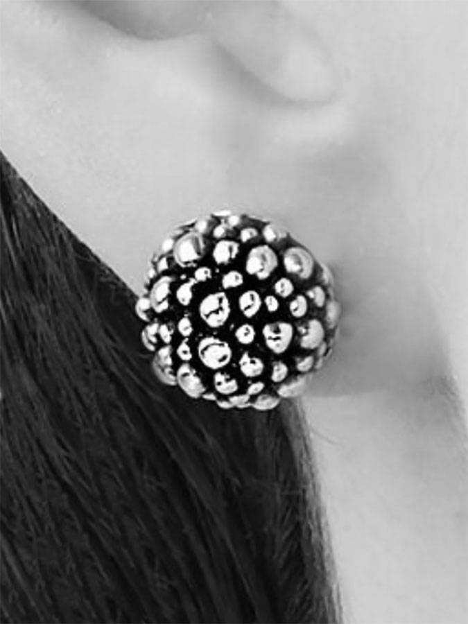 Una vera dichiarazione di stile. Ispirati ai volumi della sfera, questi orecchini sono abbelliti da mille sferette lucidissime, regalando un indosso leggero e prezioso. Essi uniscono l´eleganza contemporanea alla grande tradizione della fusione a cera persa. Misurano cm.1,2 di diametro e sono completamente fatti a mano.
