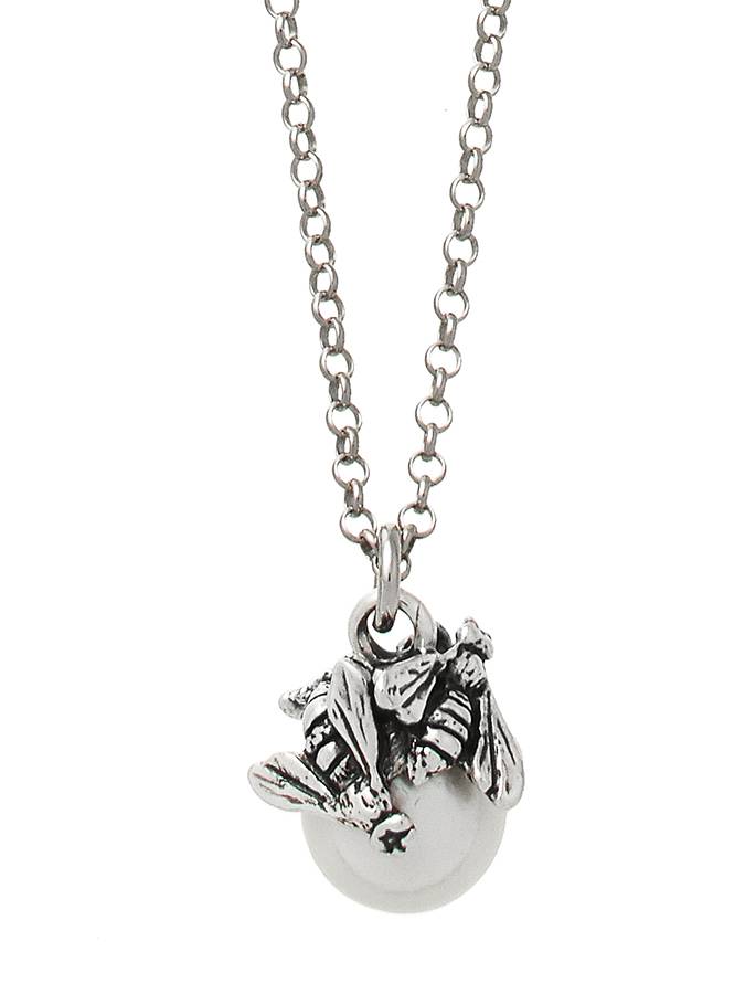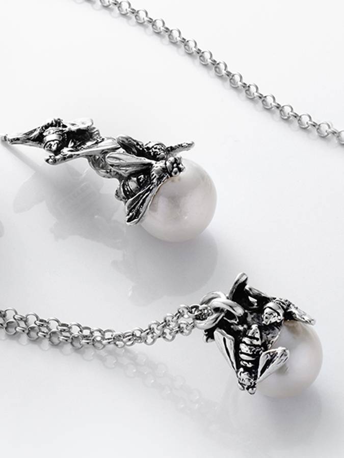 Un nugolo di piccole api lavora all´alveare appoggiato su una bella perla di acqua dolce. La collana è lunga 45 cm.