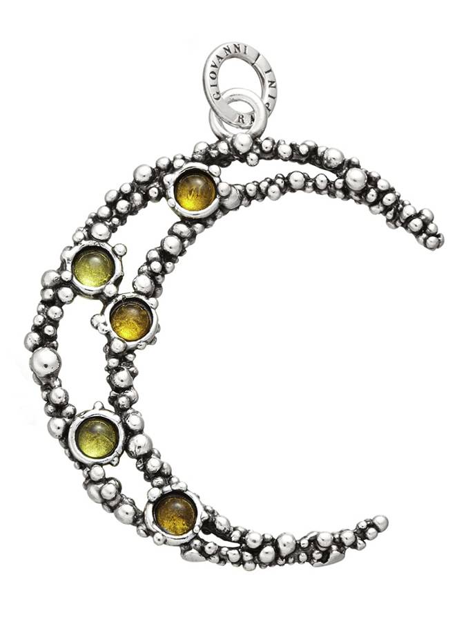 Pendente a forma di luna, con lavorazione perlage e pietrine cabochon color giallo citrino chiare e scure. E´ largo cm.4 e alto cm 5.5 compresa la maglia logata di aggancio.