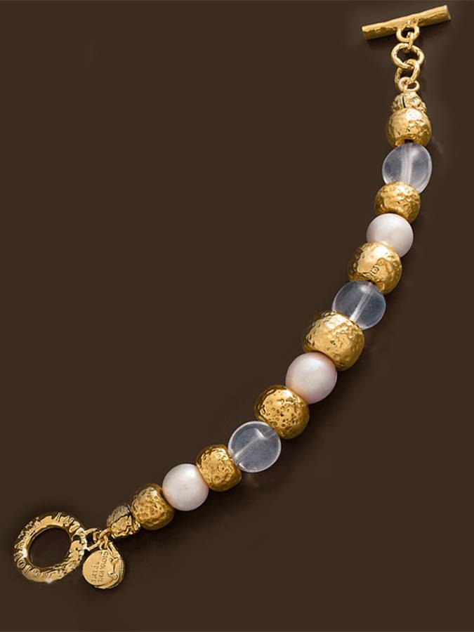 Questo raffinato bracciale elementi in bronzo martellato dorato, perle naturali d´acqua dolce e segmenti in cristallo di rocca. Munito di comoda chisura a T - bar con medesima finitura martellatata. Lavorato a mano a cera persa, misura 21 cm.