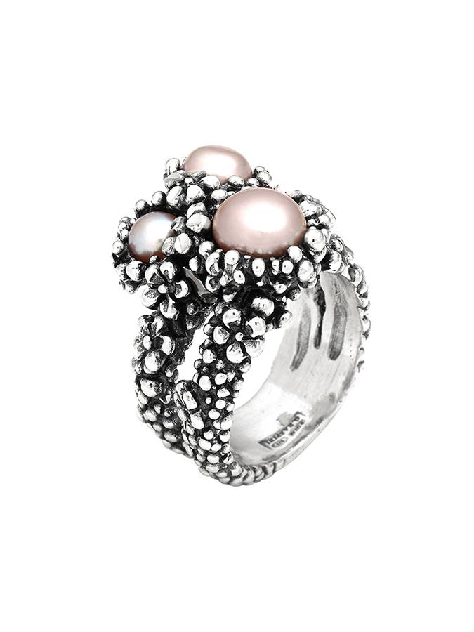 Il prezioso motivo floreale in argento fuso a cera persa e poi brunito, illuminato dalla diamantatura eseguita a mano, incastona 3 diverse perle d´acqua dolce dalla delicata nuance rosa. Misura 14. In pochi giorni si possono avere tutte le misure, dalla 12 alla 19.