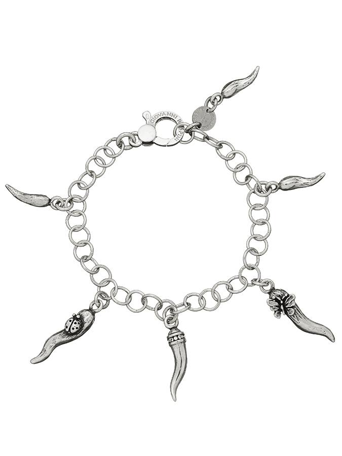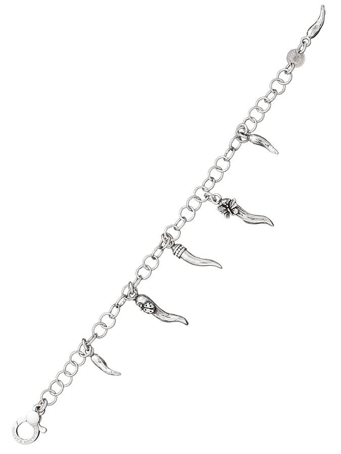 Ecco un bracciale portafortuna, con la base a catena con maglie rotonde, cinque charms a forma di cornino, più il cornino icona di Raspini alla chiusura. E´ un classico must have, sempre attuale.