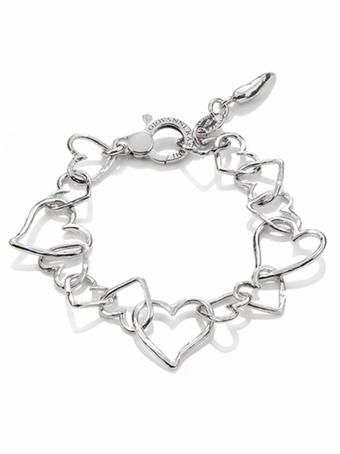 Bracciale molto femminile e delicato fatto di cuori in filo d´argentom 925 martellato, intrecciati fra loro a formare una specie di ghirlanda attorno al polso.