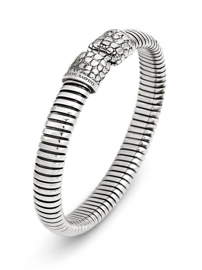 Questo bracciale rigido in argento in maglia tubogas è elegante ed avvolgente. La texture coccodrillo, che impreziosisce le estremità realizzate in fusione a cera persa lo rende particolare. +++++++++++++++++++++++++ Per indossare il bracciale consigliamo di farlo scorrere dolcemente sulla pelle allargandolo al minimo al fine di mantenerne inalterata la struttura.