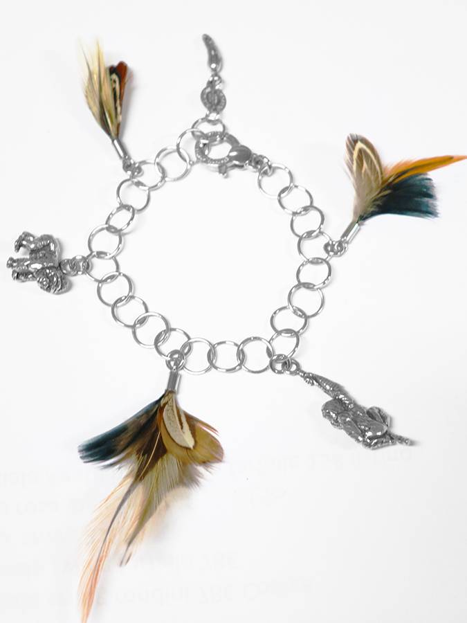 Bracciale della linea con piume, fuori produzione, con tre piumette e due charms a forma di scimmioni. La catena ha maglie rotonde e il bracciale è lungo 21 cm regolabile con l´aggancio.