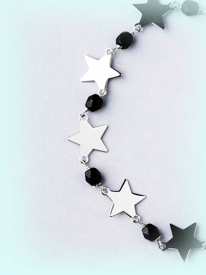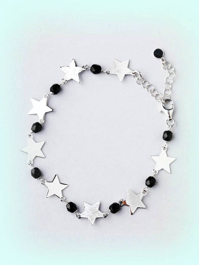 E´ un bracciale in argento 925 con stelline lucidissime e pietrine sfaccettate in onice. Le stelle, nelle foto, appaiono a volte scure per un riflesso, ma sono tutte in argento chiaro. Una catenina di allungo permette di regolare la misura.