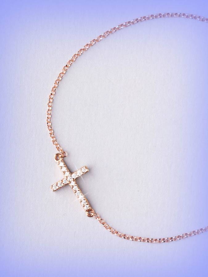 E´ un bracciale formato da una catenina sottile al cui centro si trova una piccola croce con zirconi bianchi. Tutto è argento 925 galvanizzato in oro rosa 18 kt. Lunghezza 18 cm.