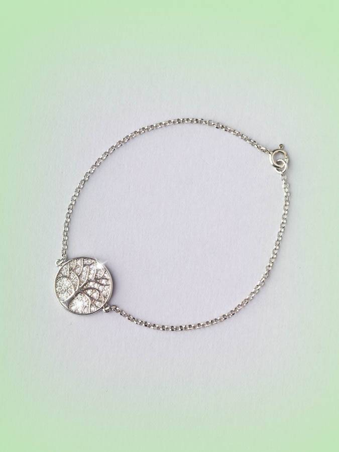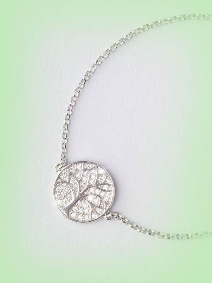 E´ un bracciale sottile, con catenina rolò fine che ha al centro un piccolo medaglione in pavé di zirconi che rappresenta l´albero della vita. E´ tutto galvanizzato in rodio e ha misura 17cm