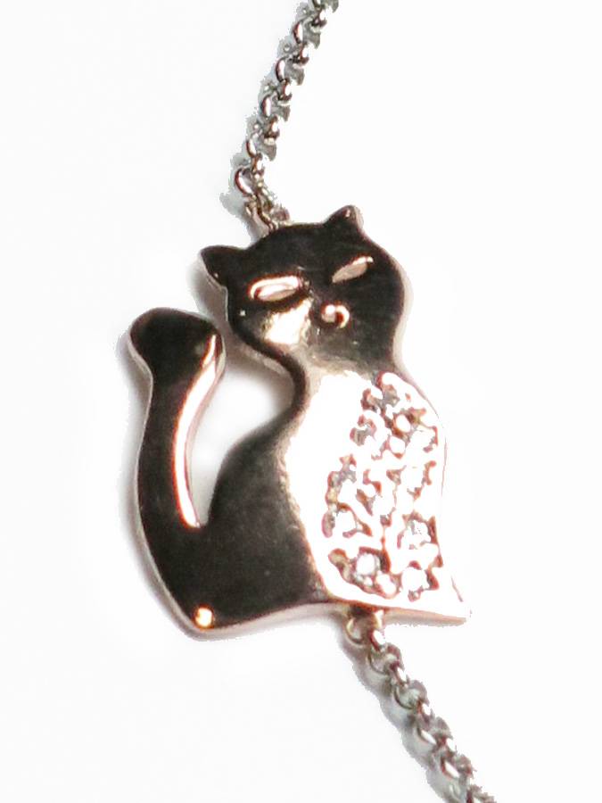 Bracciale con catenina rolò sottile rodiata e centrale in argento e zirconi a forma di micio, galvanizzato in oro rosa.