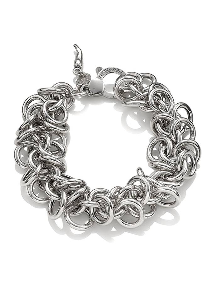 Ecco un bracciale a catena davvero isolito, formato da maglie rotonde lasciate libere e agganciate solo ad una catena fatta delle stesse maglie. E´ un bracciale molto decorativo,