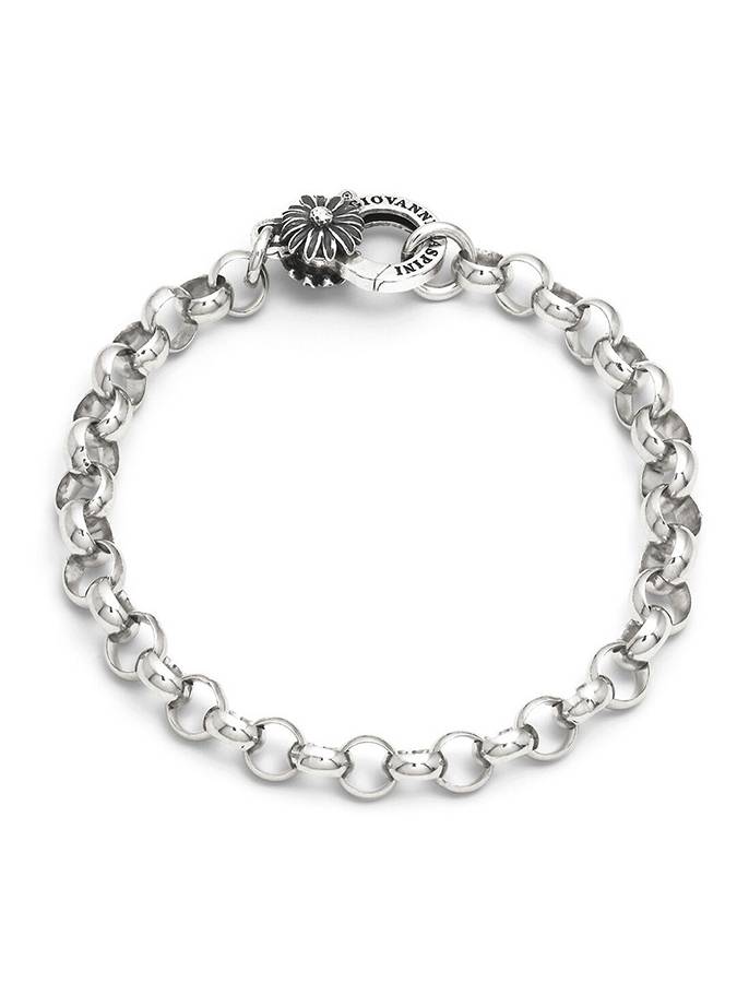 Un elegante bracciale base per i charms, pensato per accogliere i tuoi ciondoli preferiti. Realizzato a mano in argento e impreziosito da una delicata chiusura decorata con una margherita, fuso a cera persa. lUNGHEZZA 20 CM.
