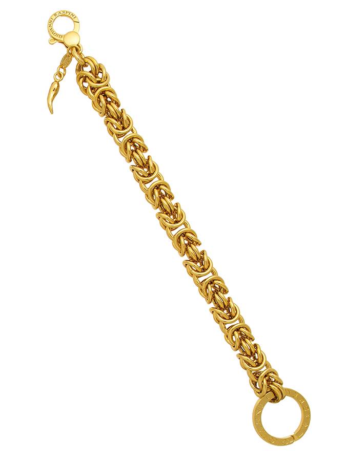 Giovanni Raspini propone un classico evergreen, rivisitandolo in termini contemporanei. Il bracciale Maglia Bizantina in argento con bagno d´oro mostra tutta l´eleganza dei volumi e la luminosità preziosa della lavorazione artigianale. Misura 21 cm.
