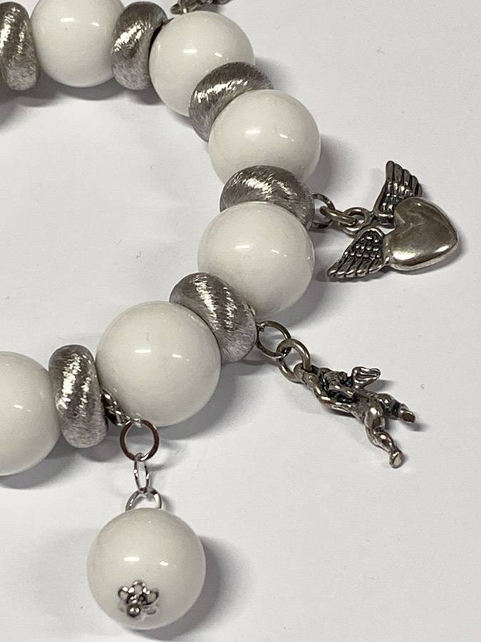 E´ un bracciale in agata bianca, inframezzata da 10 grandi ciambelle in argento satinato, montato su elastico, con nove charms a tema Angeli e cuori. il fatto che una ciambella non abbia il charm pendente non è un difetto, il bracciale è nato proprio così. E´ un pezzo da collezionisti perché fuori produzione da tanti anni, quindi difficilissimo da trovare. Ovviamente è nuovo, mai indossato.
