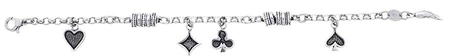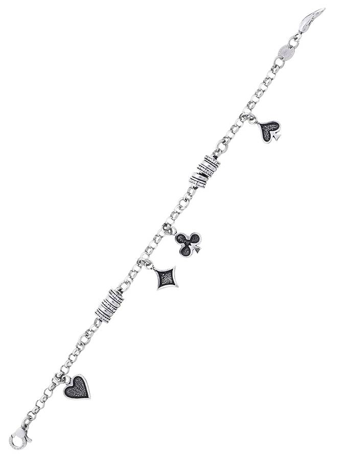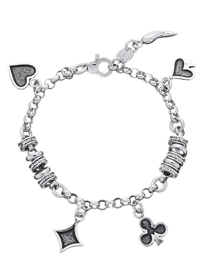 Bracciale della linea Roulette, sistema di gioielli componibili di Giovanni Raspini. Raffigura i semi delle carte da gioco e può essere integrato con charms di qualsiasi tipo (portaqfortuna, altre carte ecc...)