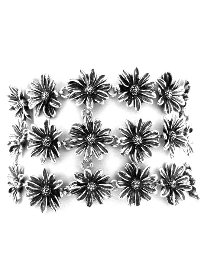 E´ un grande bracciale formato da tre file di margherite che formano un bracciale a fascia. Il motivo delle margherite è un classico di Raspini ed è molto decorativo. Il bracciale è lungo 18 cm. e alto 4.2 cm. ed ha un ottimo prezzo perché è fuori produzione