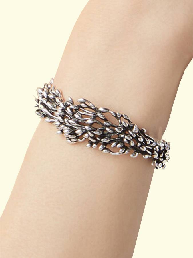 Bracciale semirigido snodato. Il motivo decorativo è un insieme di piccole bacche lucide su argento 925 brunito. E´ elegante e insolito.