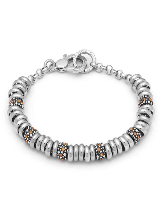 Realizzato completamente a mano in azienda, questo bracciale Charms in argento, giovane e luminoso, monta sei beads in argento brunito con decoro Perlage e micro inserimenti in zircone giallo, inframmezzati da ciambelline in argento. Lunghezza cm. 20